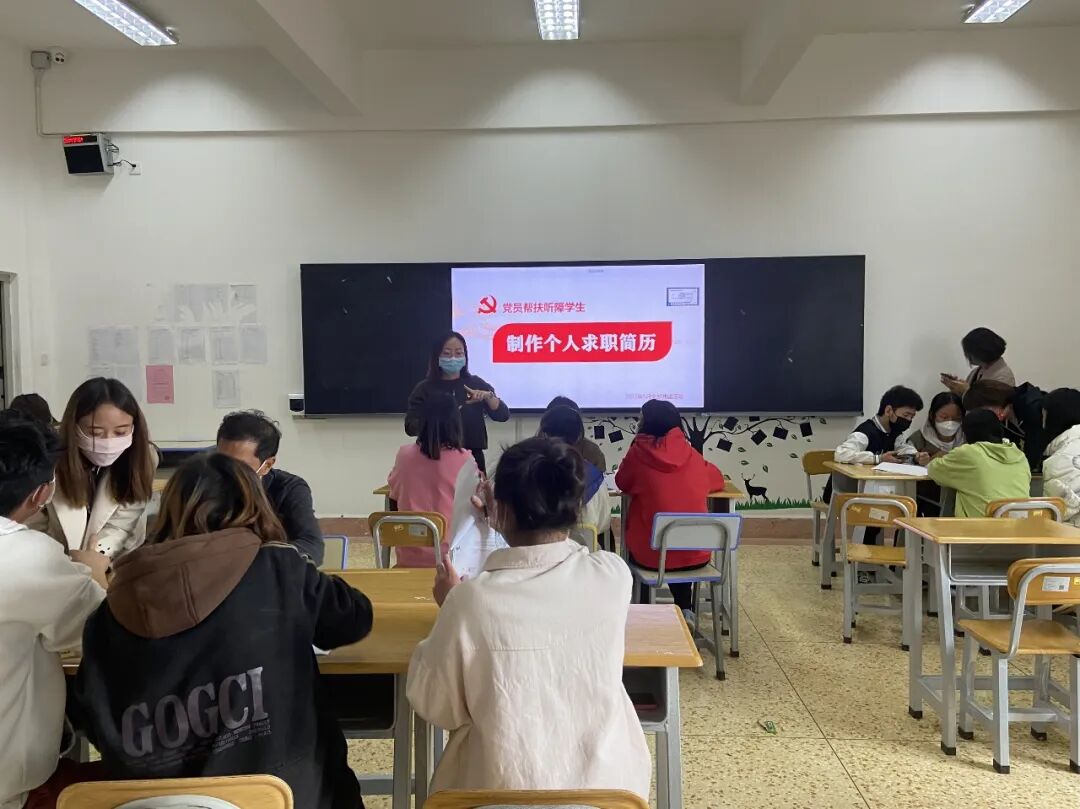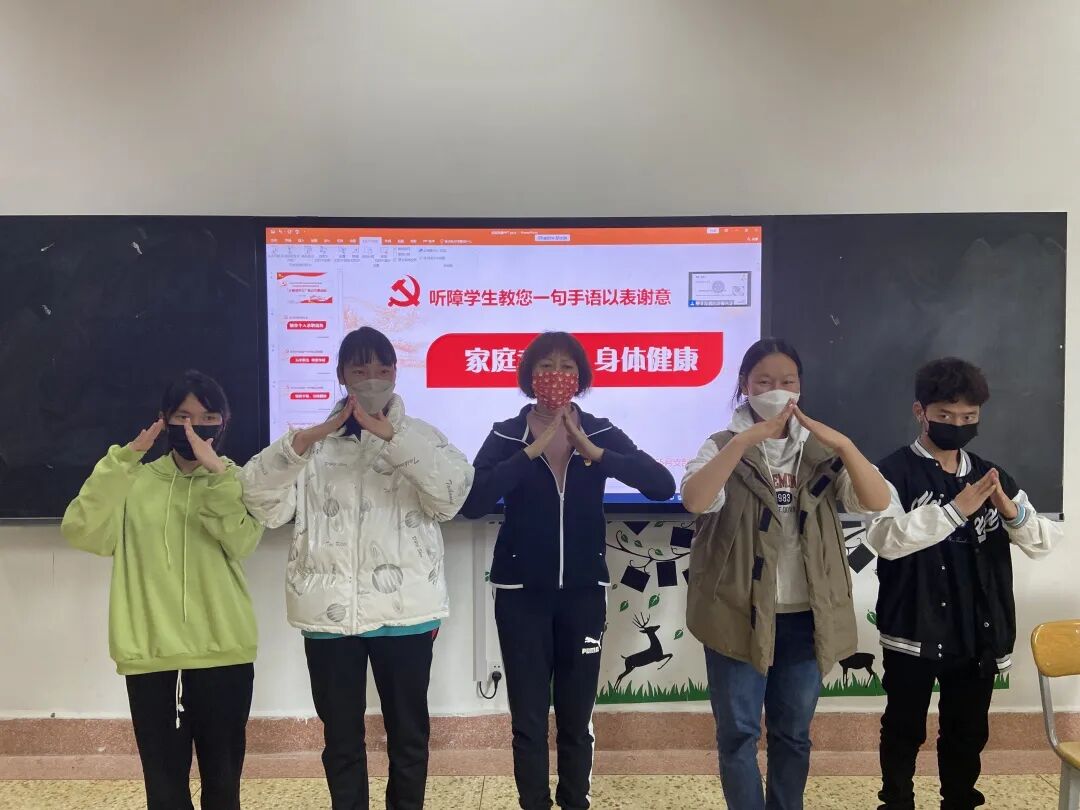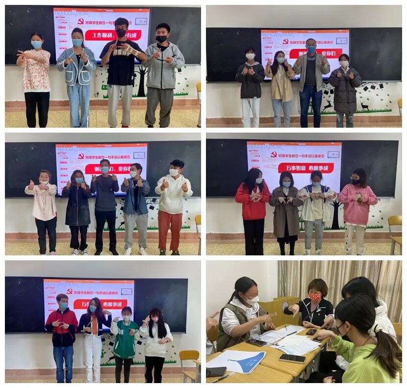 座谈会结束后,大家来到云南特殊教育职业学院艺术系实训活动室,在手语教师的协助下,让我院党支部党员教师指导听障学生进行简历制作与详细的分析。之后,我院党支部的党员教师和听障学生们一起学习了“身体健康、万事如意、家庭幸福、工作顺利、事业有成、谢谢你们、爱你们”的手语。