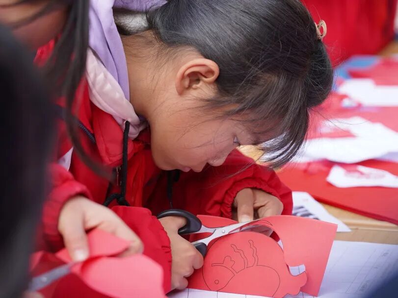 最令人期待的游园活动环节丰富多彩。“毛笔书春韵”处,孩子们手握毛笔,在老师的指导下写下一个个充满童趣的“福”字,墨香四溢;“巧手剪窗花”区域,孩子们用剪刀在彩纸上精心剪裁,不一会儿,形态各异的窗花便诞生了;“绳艺编福结”前,孩子们认真学习编织技巧,将美好的祝福融入绳结之中;“慧心猜年俗”吸引了众多好奇的目光,孩子们通过猜灯谜了解年俗知识;“彩笔绘年画”让孩子们用画笔描绘出心中的新春景象;“沙包掷靶盘”“欢乐踩气球”“红绸舞秧歌”“黏土塑春意”“击鼓争凳座”等游戏也让孩子们乐此不疲。