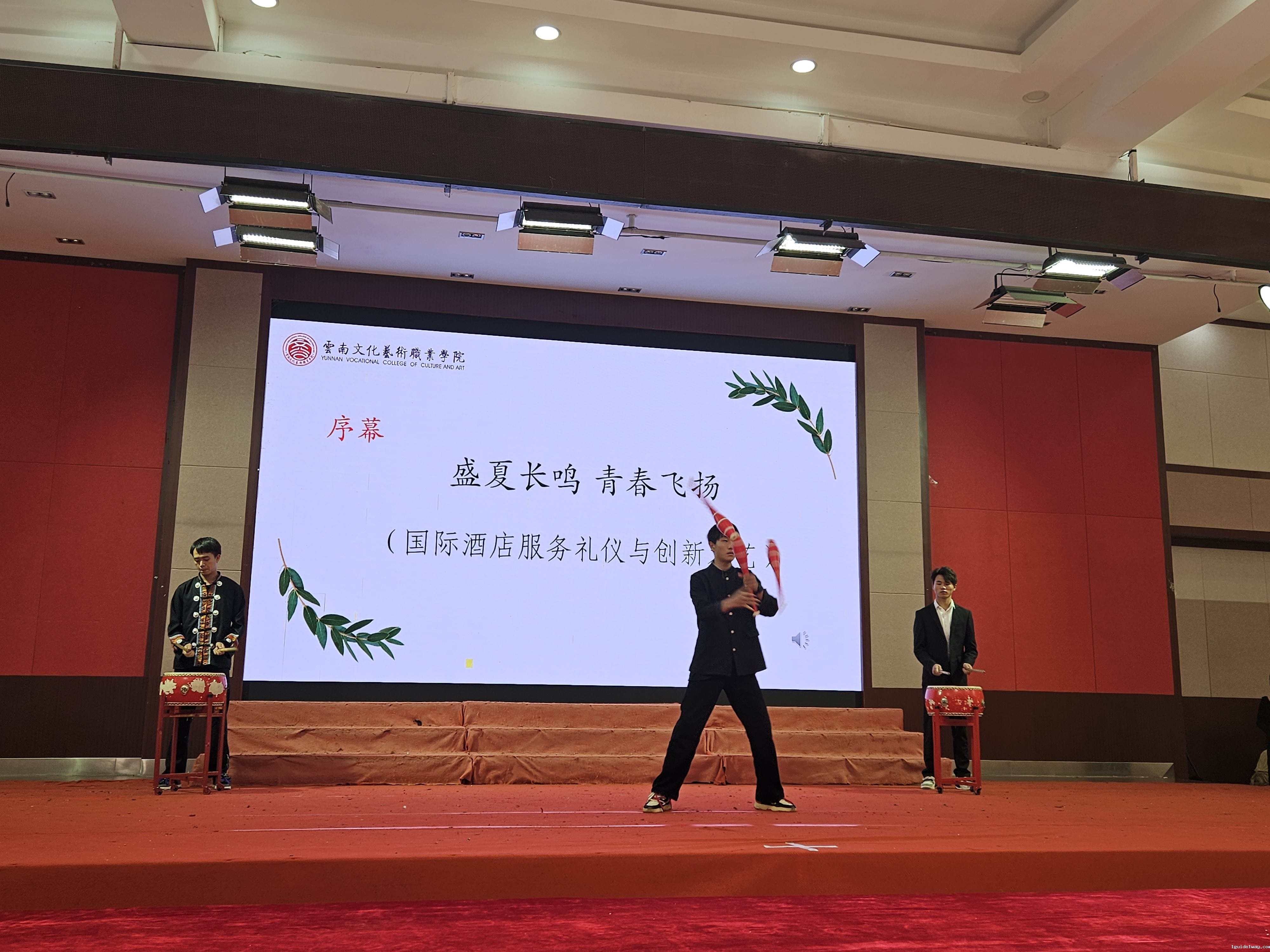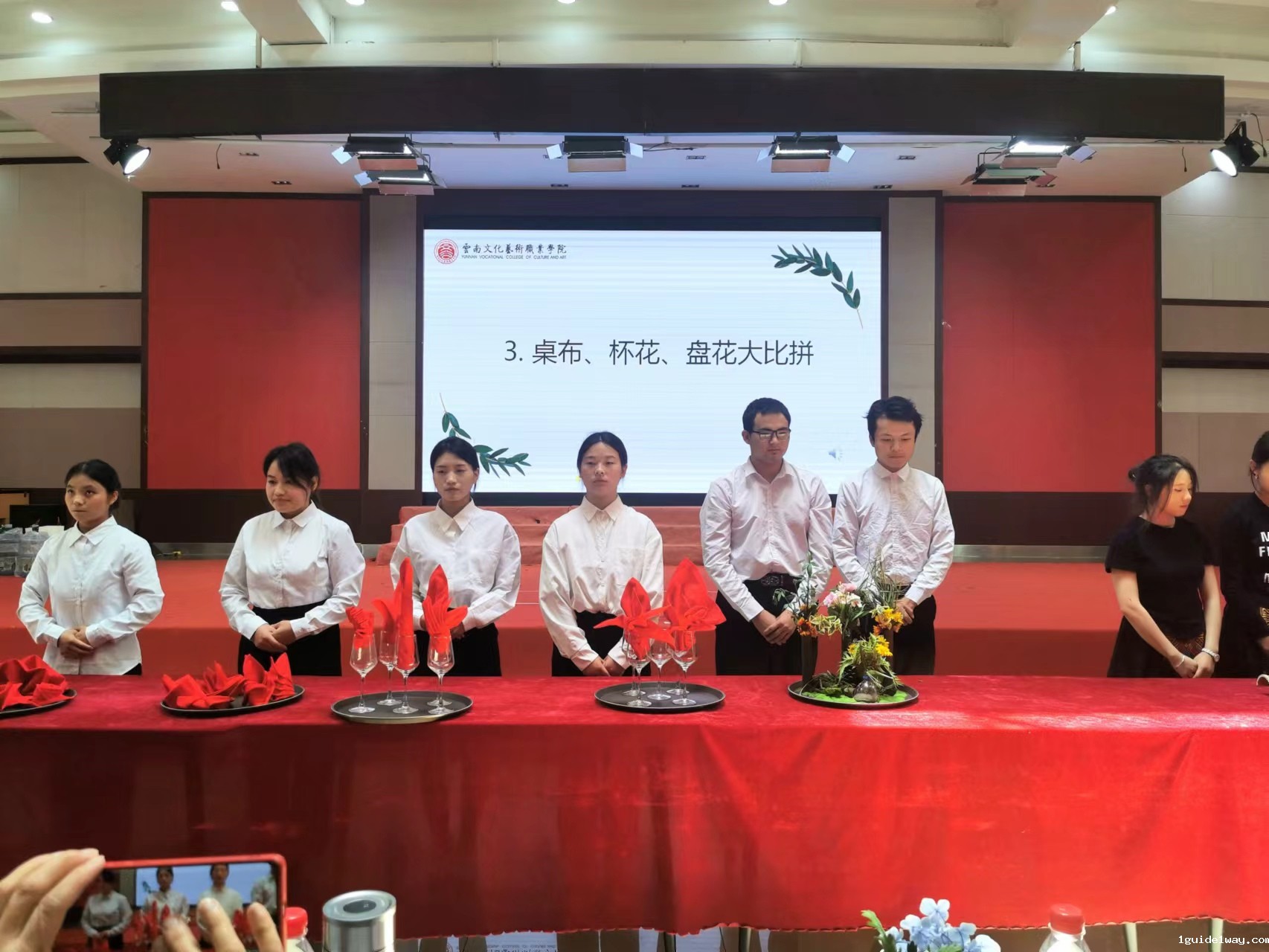 开篇以国际酒店服务礼仪演绎拉开序幕,在鼓乐齐鸣声中,酒管的小伙子带来了抛杰克棒的杂耍表演,现场掌声四起。宴会前布场项目组的同学们在短短几分钟内就呈现出了精美的中餐宴会台面设计,心灵手巧的酒管学子折叠出了栩栩如生的各种餐花和盘花,用竹子和各类应季植物制作了诠释“环保”和“生态”理念的桌面中心装饰物。宴会中餐间服务涵盖了调酒、酒水品鉴、茶艺、果盘和咖啡的现场制作。各才艺组同学登台竞相角逐。鸡尾酒现场调制精彩纷呈,色彩斑斓,唤醒了现场师生的味蕾。酒水组带来了云南少数民族敬酒串烧和葡萄酒品鉴。同学们还结合了云南本土的地域文化特色,在酒店餐饮服务技能中讲起了云南普洱茶和小粒咖啡的故事:现代版斗茶和云咖呼唤。云南浓郁民族风和国际服务范儿的创新融合给观众留下了深刻的印象。现场还布置了师生的共同作品:鸡尾酒展台、茶歇展台和高星级酒店果盘展。