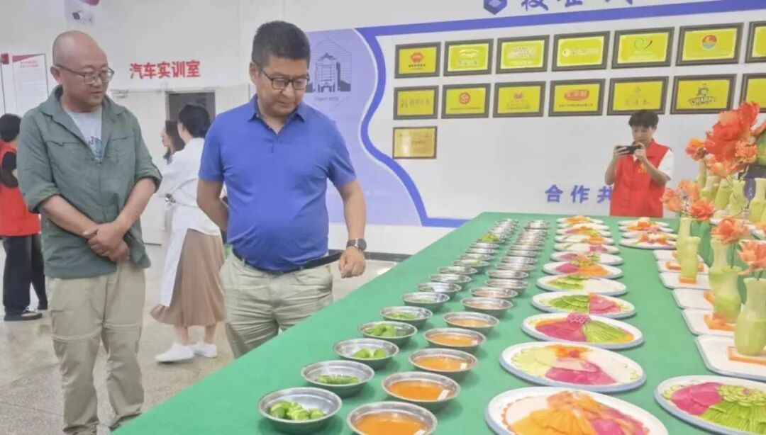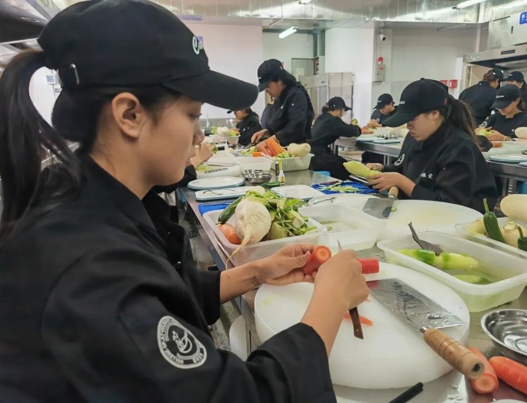 比赛开始后,同学们迅速投入状态,手起刀落,原本普通的食材,在砧板上开出了“花”。切片、切丝、雕刻,各种刀法被同学们展现的淋漓尽致;各式各样的拼盘,美妙绝伦,展现出了学生扎实的基本功。