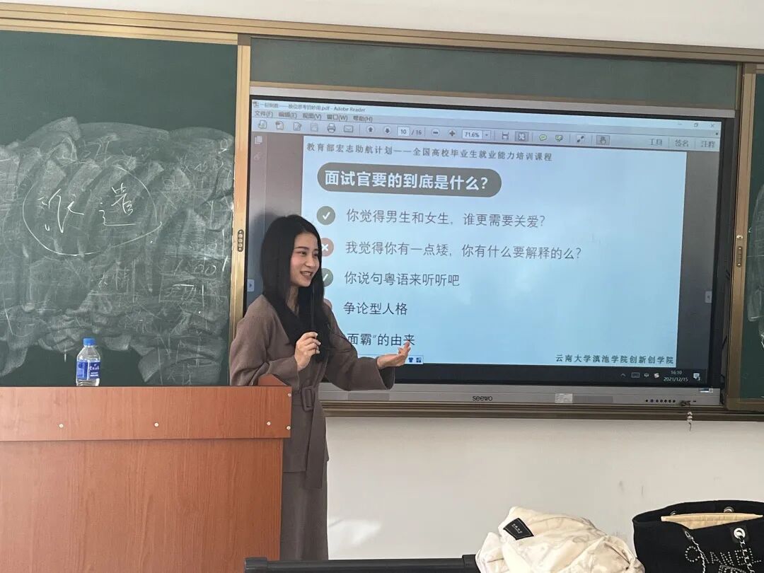 蔡聂奎处长为此次开班仪式致辞,并对学员提出了三点希望和要求:一是提高认识,遵守纪律;二是努力学习,专心听讲;三是学以致用,增长本领。不断提升自身的求职就业能力。云南大学滇池学院招生就业处蔡煜处长为同学们介绍了本次培训的背景、主题、培训老师等相关内容,希望此次活动能帮助同学们提升求职能力,实现更高质量和更加充分就业。