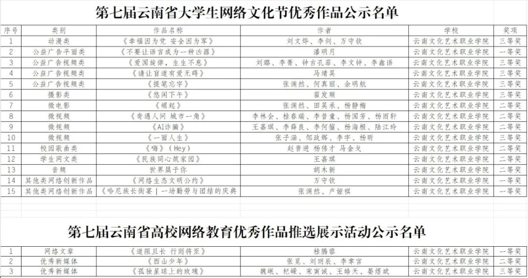 近日,省委教育工委、省委网信办联合举办的第七届“云南省大学生网络文化节”和“云南省高校网络教育优秀作品推选展示活动”的获奖名单公布。我院15项大学生网络文化节优秀作品、3项高校网络教育优秀作品荣获省级奖项。具体获奖情况如下: