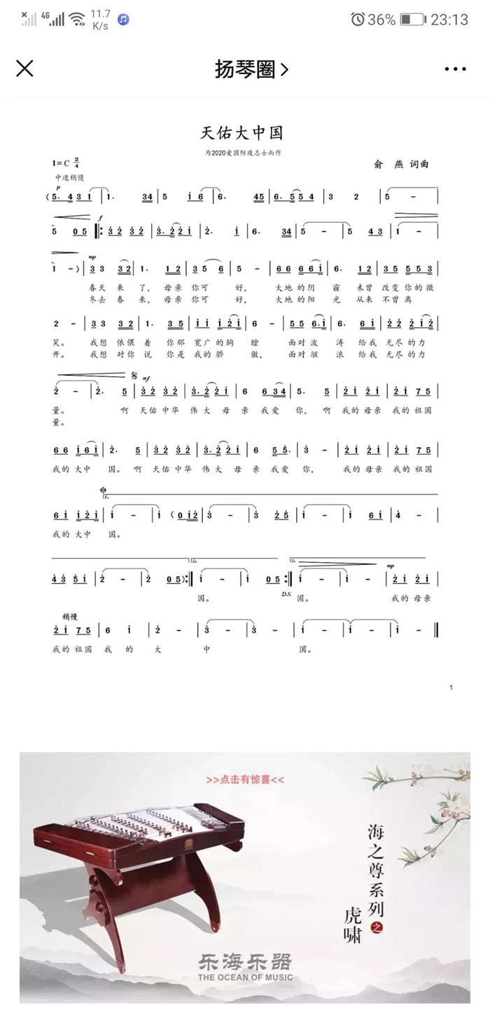 受抗击新冠肺炎疫情的英雄事迹感染,音乐学院俞燕院长提笔创作了歌曲《天佑大中华》,向奋战在抗疫一线的英雄们致以崇高的敬意!谈到创作过程,俞院长说,虽然我们无法与战斗在一线的英雄同行,但可以用歌声向他们致敬!他们的付出给予了我们希望,他们的坚守带给了我们信心,他们才是祖国最可爱的人。《天佑大中华》发表在中国扬琴网官方微博《扬琴圈》,并在云南音乐“云南抗击新型冠状病毒公益歌曲”平台展播。