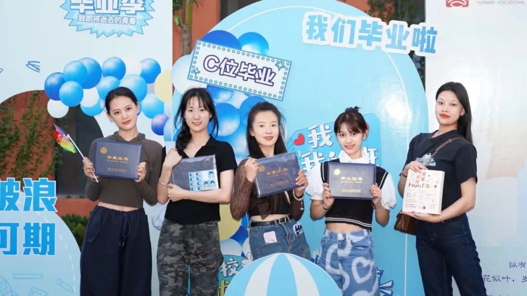 “乘风破浪 未来可期”“三年云艺职院 我们不说再见”寄托了我们对毕业生美好的祝愿;三号教学楼门口,“我们毕业啦”的拍照框和纪念墙,吸引着众多毕业生驻足合影,留下了青涩岁月的难忘影像。