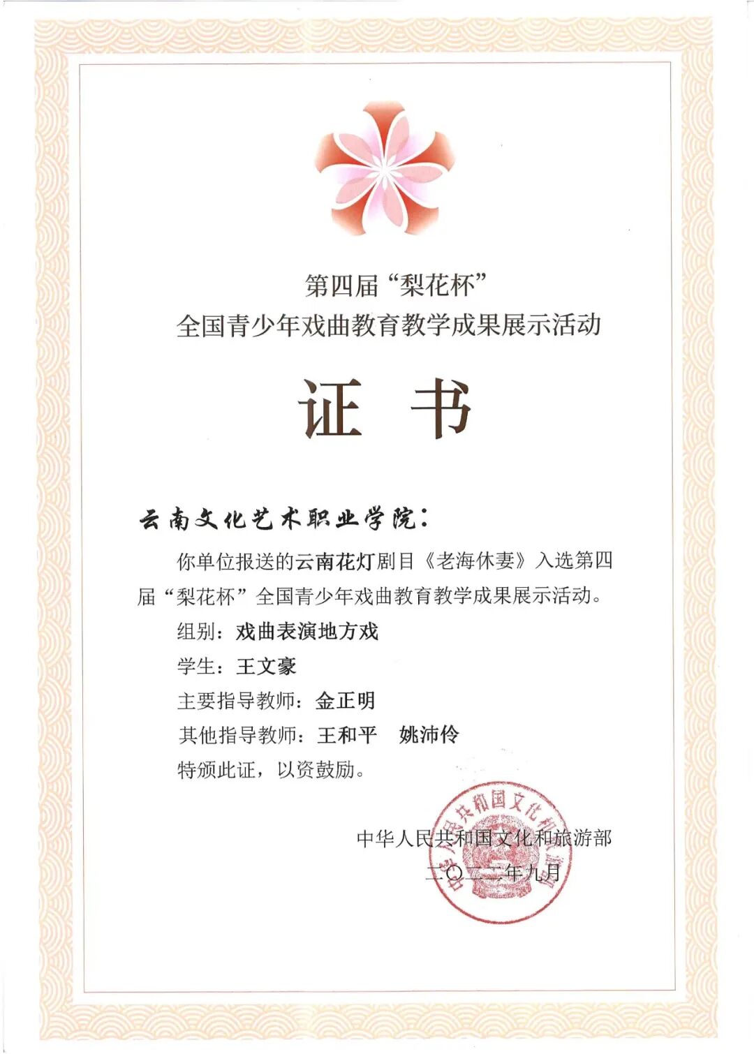 2023年5月,戏曲学院花灯剧目入选第四届“梨花杯”全国青少年戏曲教育教学成果展示活动。“梨花杯”是文化和旅游部推动全国戏曲教育工作和戏曲专业人才培养的一项重要品牌活动,在全国戏曲专业教育领域具有重要影响力。戏曲学院领导班子经过认真研究,选拔了十多名骨干师生组成教学团队,精细打磨出花灯精品小戏《老海休妻》,在全国222个节目、十多个剧种中突出重围,入选本次展演活动。云南花灯艺术守正创新薪火相传,学生精湛的表演技艺和扎实的花灯剧功底赢得全国专家及评委的一致肯定。