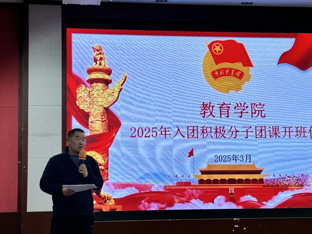 在开班仪式上,教育学院党支部书记王绍坤同志致辞。他提出了对入团积极分子们的提出以下几点希望:第一,要以信仰为舵,做理想坚定的追梦者。牢牢把航定向,将个人理想融入国家命运。第二,以学习为桨,做知行合一的践行者。要善于把所学的知识运用到实践中,在实践中求得真知。第三,以责任为帆,做时代使命的担当者。能在社会服务中传递温暖,在校园生活中弘扬正气。他强调,广大青年要把爱国情、报国志真正落到实处,成为新时代有理想、敢担当、能吃苦、肯奋斗的新青年。